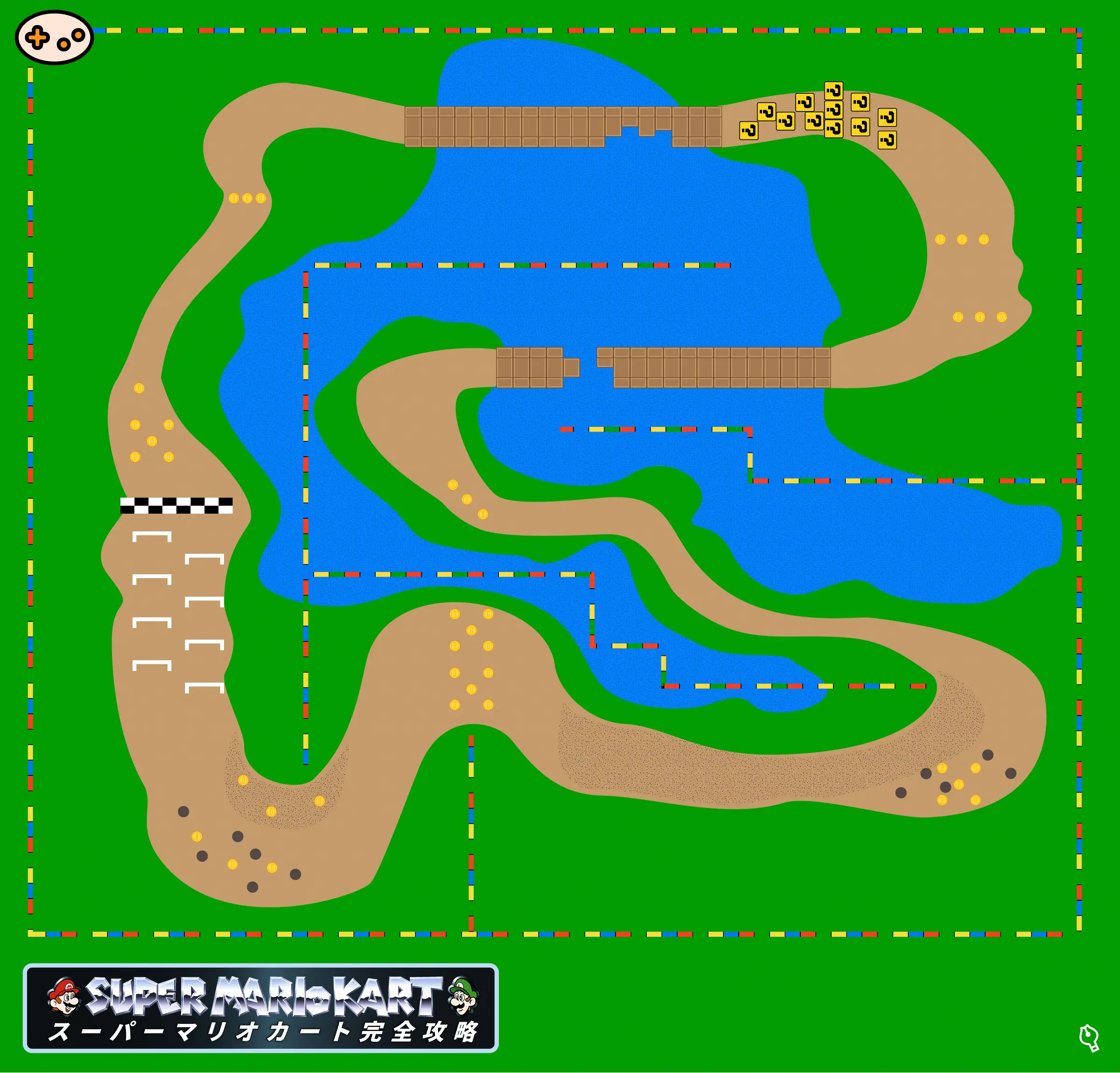 ここでキノコがあればジャンプバンの手前で使ってジャンプすると大幅にジャンプできて、図のようにショートカットができる。ハネを持っている時は、手前で使うと向こう側へジャンプして、ショートカットができる。