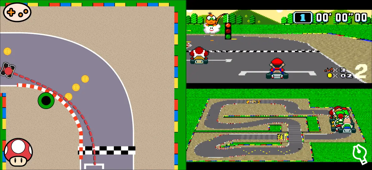 このコースは、スタート直後の加速が勝負の鍵を握ります。「1」のカウントダウンでアクセルを押し、緑信号と同時に離すことでロケットスタートが決まります。土管に当たらないよう、しっかり中央を通るようにしよう。