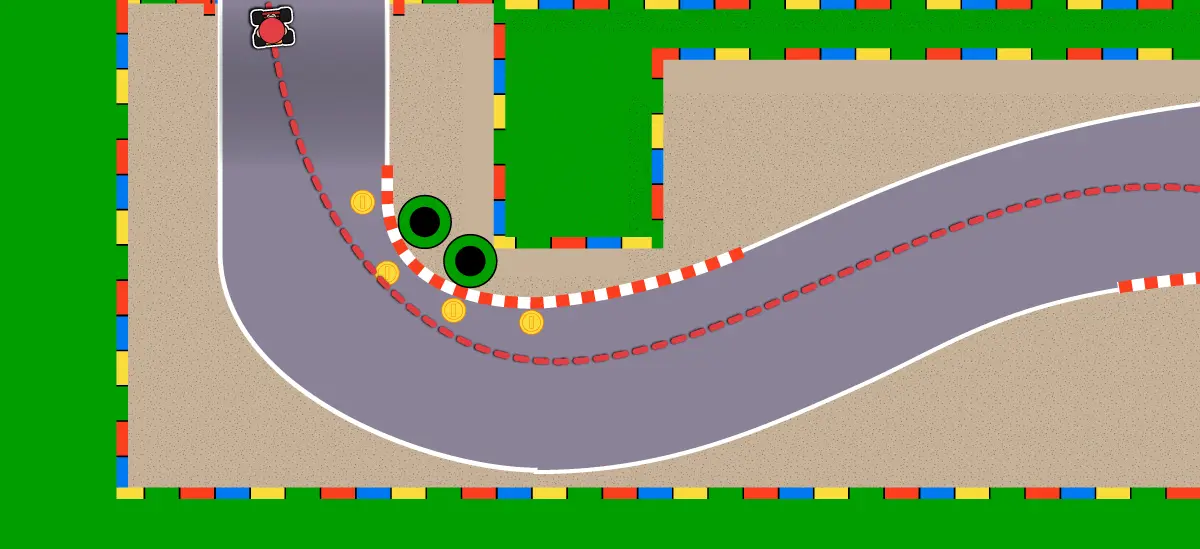ここは図のようなコースで曲がると速いのでおすすめだ。早めにハンドル操作を始めると、スムーズに曲がることができる。
