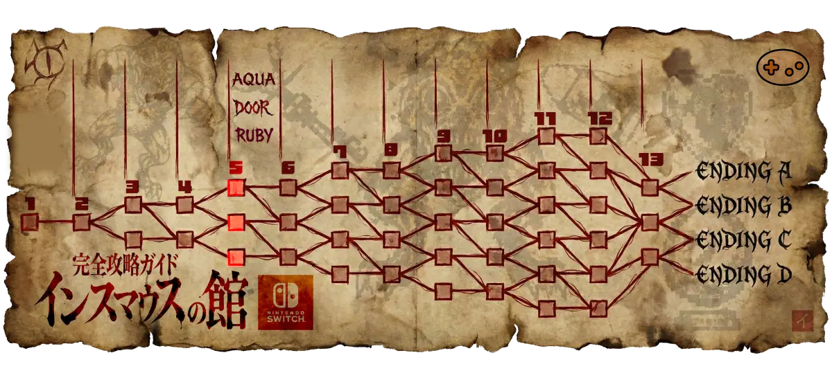 インスマウスの館5階は、本作で初めて3方向に分岐する重要な階層である。上位ルート「AQUA」はエンディングA圏内、中位「DOOR」はB圏内、下位「RUBY」はC圏内への分岐点となる。