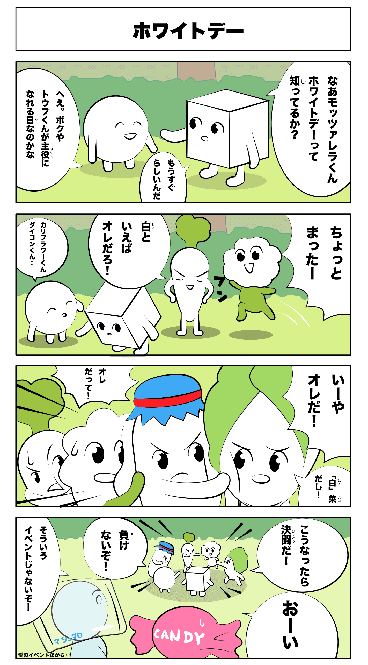 | とうふくん | 自分探し中の絹ごし豆腐 高野豆腐くんとは幼いころからの親友で、非常に友だち思い 不言実行がモットーで、時々思い切った行動に出て周囲を驚かせる |