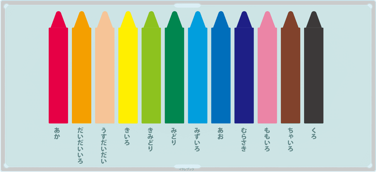 | あか | だいだいいろ | きいろ | みどり | みずいろ | あお | むらさき | ももいろ |