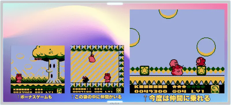 何でも吸い込めるカービィを操作して進める、やさしいアクションゲーム。