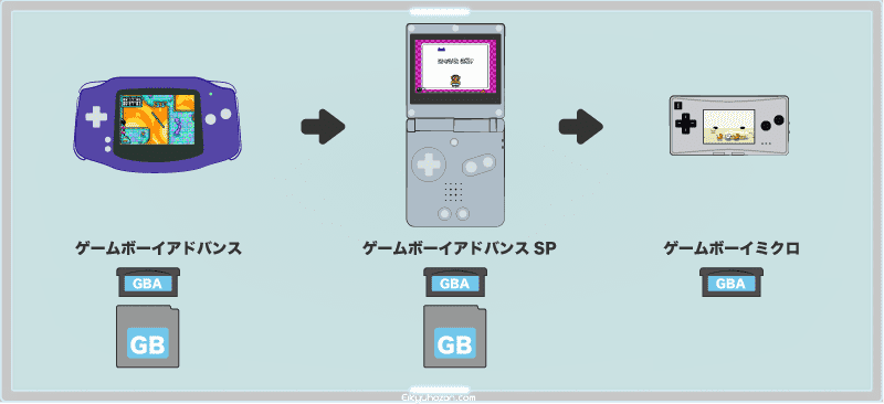 「ゲームボーイアドバンス」から「ゲームボーイアドバンスSP」、「ゲームボーイミクロ」へとなり、より持ち運びやすく、さらに遊びやすくも進化している。