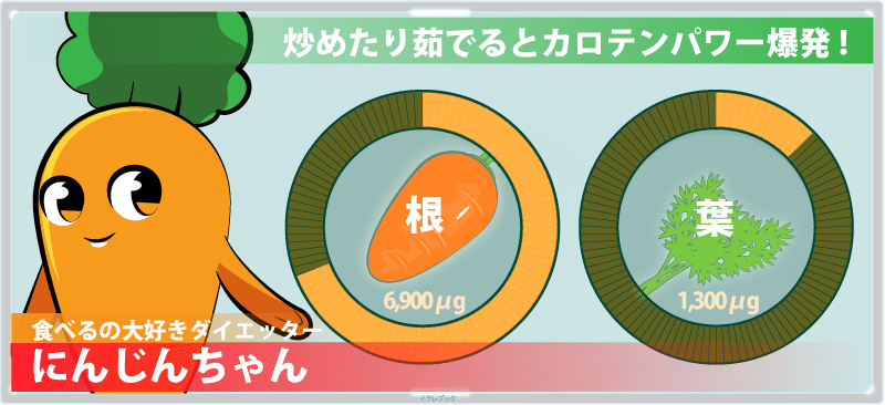 (生野菜時のβカロテン含有量:根6,900μg、葉1,300μg)